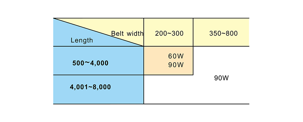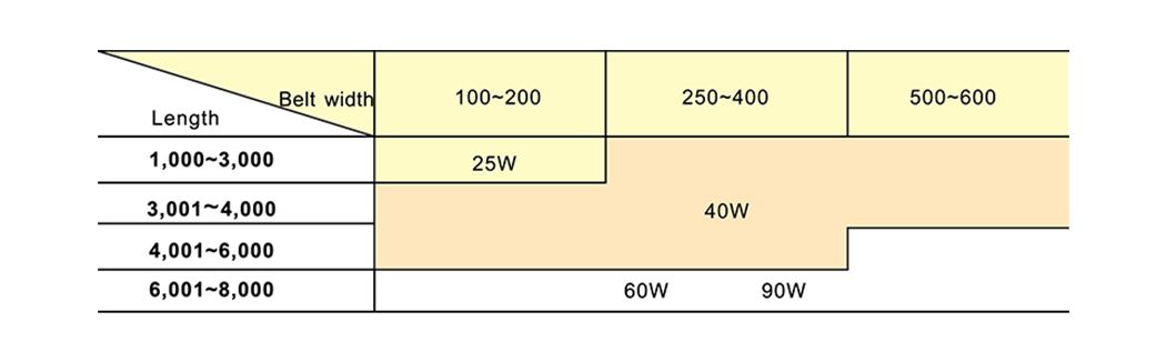 De werkelijke dimensie van de riem wordt 5 mm versmald dan boven de standaardriem; Als de lengte van de machine 4 m overschrijdt, met specificaties van riem 500, 600 voor breedte wordt deze 10 mm versmald.